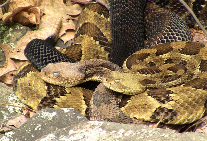 Milk snakes and garter snakes are often mistaken for timber rattlesnakes, even though they don't have rattles and are significantly smaller in size. Neither of them are venomous and are commonly found in neighborhood backyards.